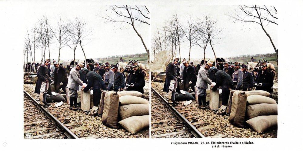 "Élemiszerek átvétele a lövészárkok részére" - Delivery of food for the trenches.