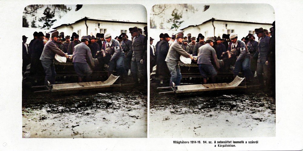 "A sebesültet leemelik a szánrói a Kárpátokban" - A wounded person is lifted off his sled in the Carpathians
