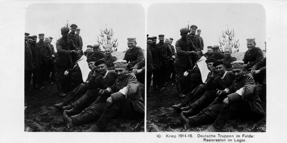 "Deutsche Truppen im Felde: Rasiersalon im Lager" - German troops in the field: shaving parlor in the camp