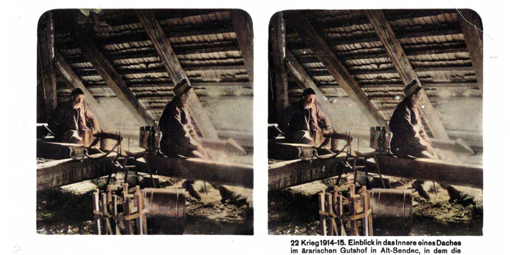 "Einblick in das Innere eines Daches im ärarischen Gutshof in Alt-Sendec, in dem die Russen 4 Maschinengewehre herausgesteckt hatten" - Insight into the inside of a roof in the Aryan manor in Alt-Sendec, in which the Russians had stuck 4 machine gun