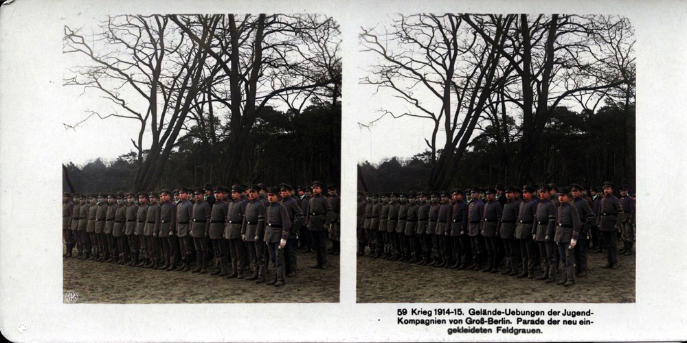 "Gelände-Uebungen der Jugend-Kompagnien von Groß-Berlin. Parade der neu eingekleideten Feldgrauen" - Off-road exercises by the youth companies of Greater Berlin. Parade of the newly dressed field gray