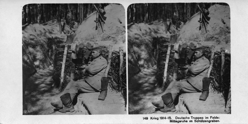"Deutsche Truppen im Felde: Mittagsruhe im Schützengraben" - German troops in the field: afternoon rest in the trenches