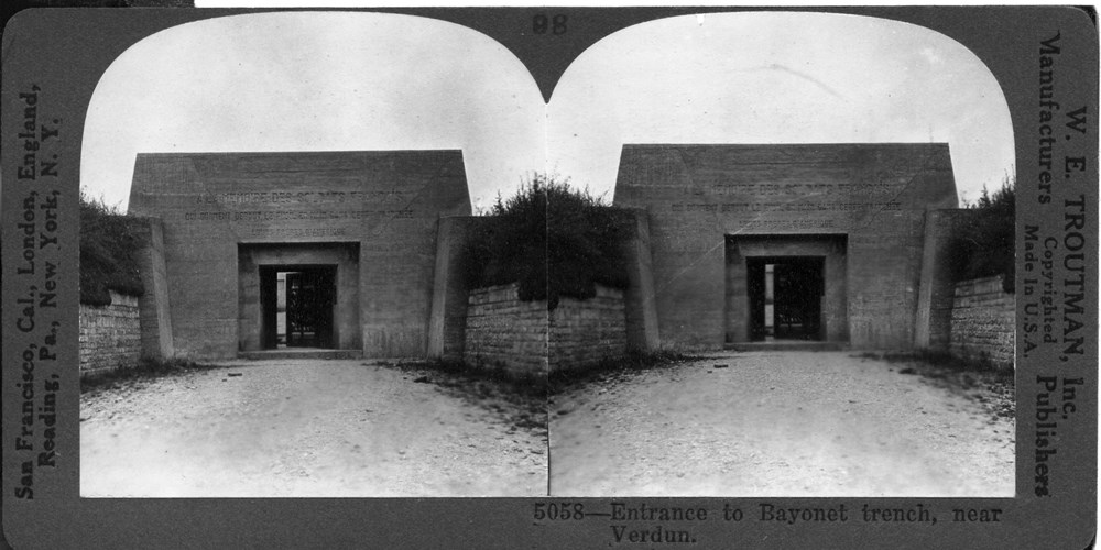 see also: https://www.atlasobscura.com/places/trench-bayonets ; http://www.worldwar1.com/heritage/bayonet.htm; https://www.tripadvisor.com/Attraction_Review-g187165-d3227583-Reviews-Trench_of_the_Bayonets-Verdun_Meuse_Grand_Est.htmlImage Id: 2494 Contributor: The Jordan/Ference Collection Theatre: Post-War Subject: Cemeteries & Monuments Location: Bayonet Trench, Verdun, France Regiment: Unknown Service Arm: Unknown Battle: Unknown Date: Unknown Combatants: Unknown Publisher: W. E. Troutman Source: American Directory: 1-100