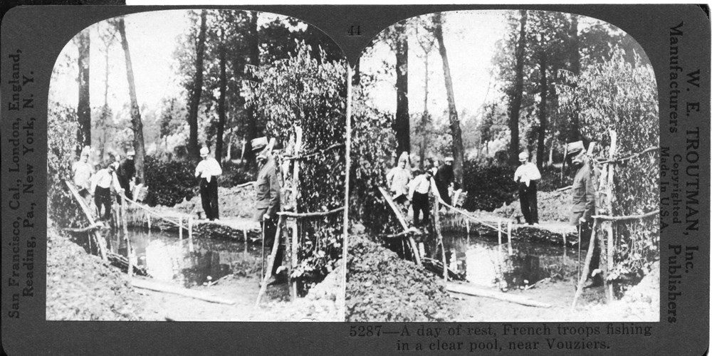 A day of rest, French troops fishing in a clear pool, near Vouziers