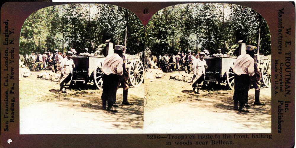Troops en route to the front, halting in woods near Belleau