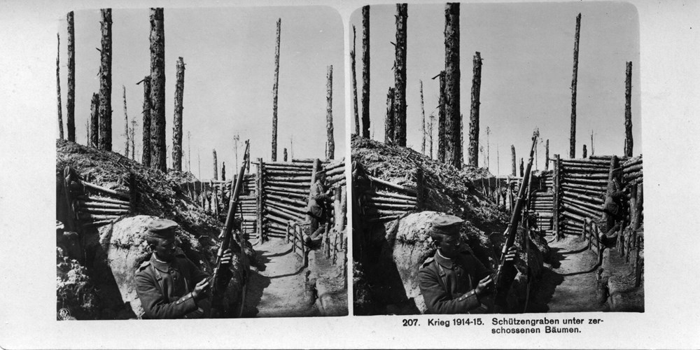 "Schützengraben unter zerschlossenen Bäumen" - Trenches under closed trees