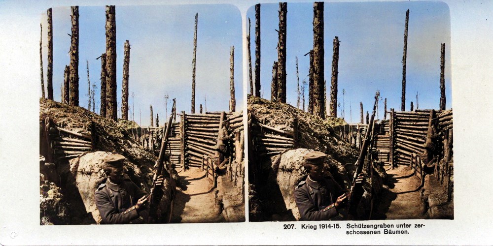 "Schützengraben unter zerschlossenen Bäumen" - Trenches under closed trees