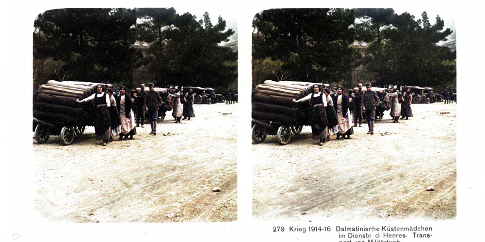 "Dalmatinische Küstenmädchen im Dienste des Heeres. Transport von Militärtuch" - Dalmatian coastal girls in the service of the army. Transport of military cloth