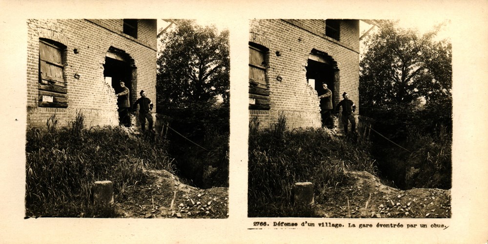 "Défense d'un vlilage. La gare éventrée par un obus" - Village defence. The railway station gutted by a shell