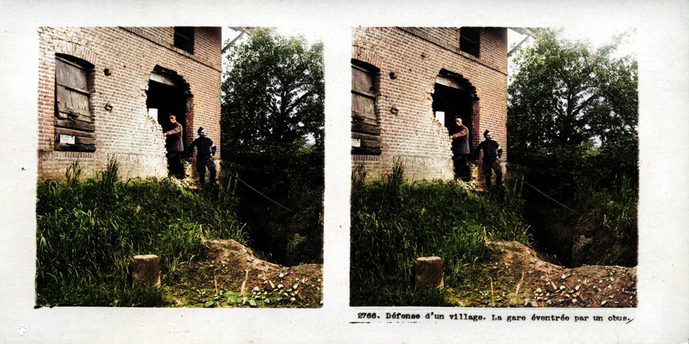 "Défense d'un vlilage. La gare éventrée par un obus" - Village defence. The railway station gutted by a shell