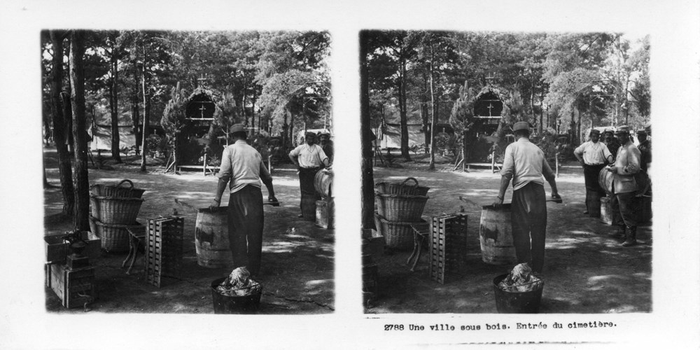 "Une ville sous bois, Entrée du cimetière" - Wooden town. Entry to the cemetery