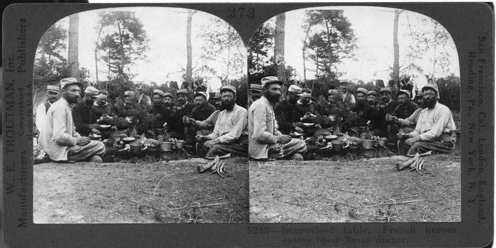 Improvised table. French heroes eating their Xmas dinner