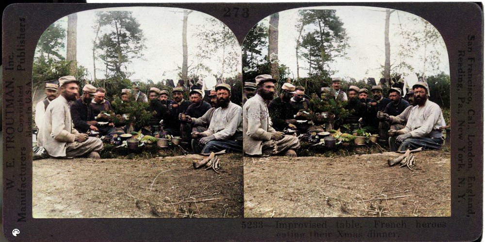 Improvised table. French heroes eating their Xmas dinner