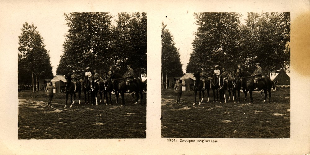 Image Id: 2827 Contributor: The Jordan/Ference Collection Theatre: Western Front Subject: Behind the Lines Location: Unknown Regiment: Unknown Service Arm: Cavalry Battle: Unknown Date: Unknown Combatants: English Publisher: Paris-Stéréo Source: French Directory: 2901 Plus