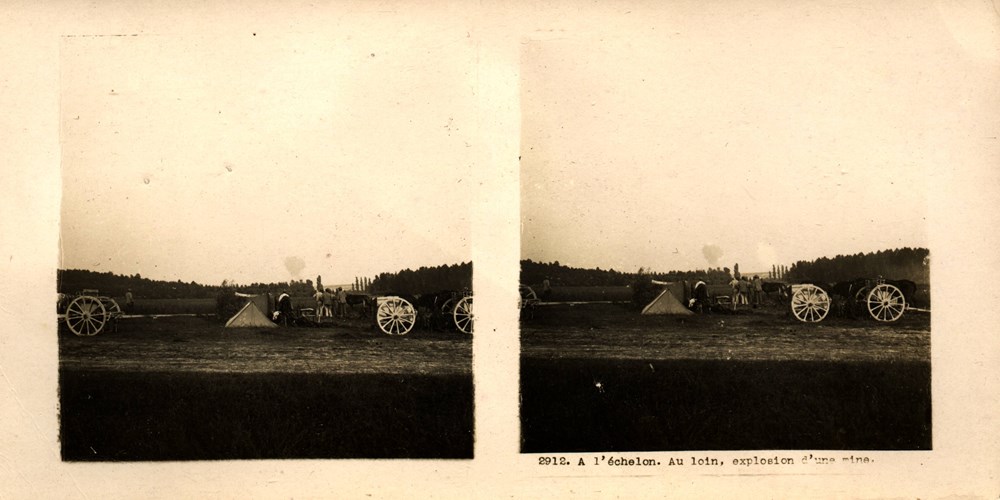 "A l'échelon. Au loin, explosion d'une mine" - Gunnery. In the distance, explosion, of a mine