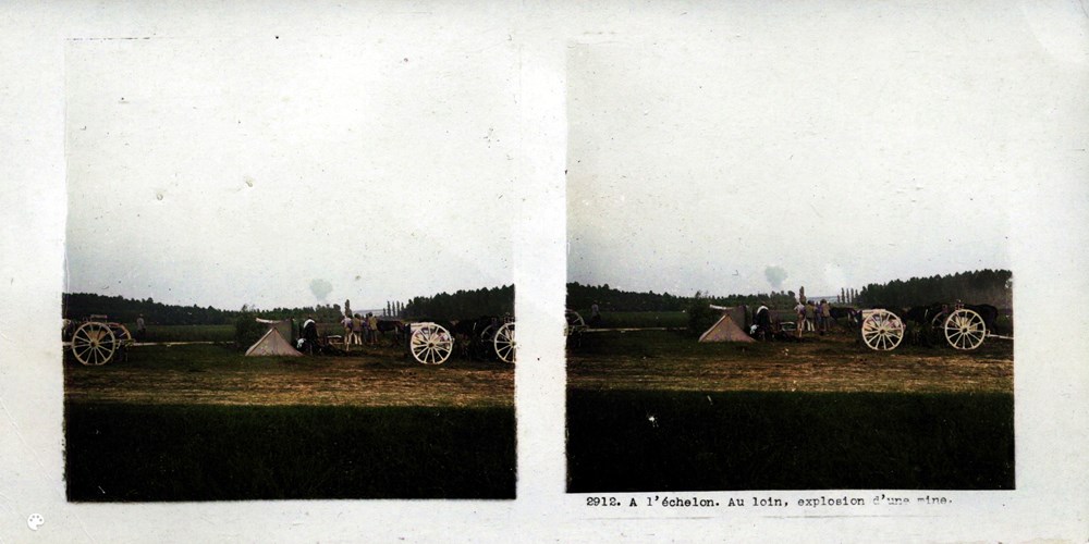 "A l'échelon. Au loin, explosion d'une mine" - Gunnery. In the distance, explosion, of a mine