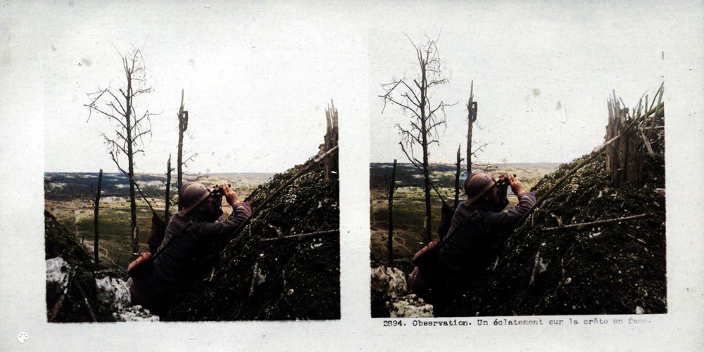 Image Id: 2985 Contributor: The Jordan/Ference Collection Theatre: Western Front Subject: The Front Line Location: France Regiment: Unknown Service Arm: Artillery Spotters Battle: Unknown Date: Unknown Combatants: French Publisher: Paris-Stéréo Source: French Directory: 2801-2900