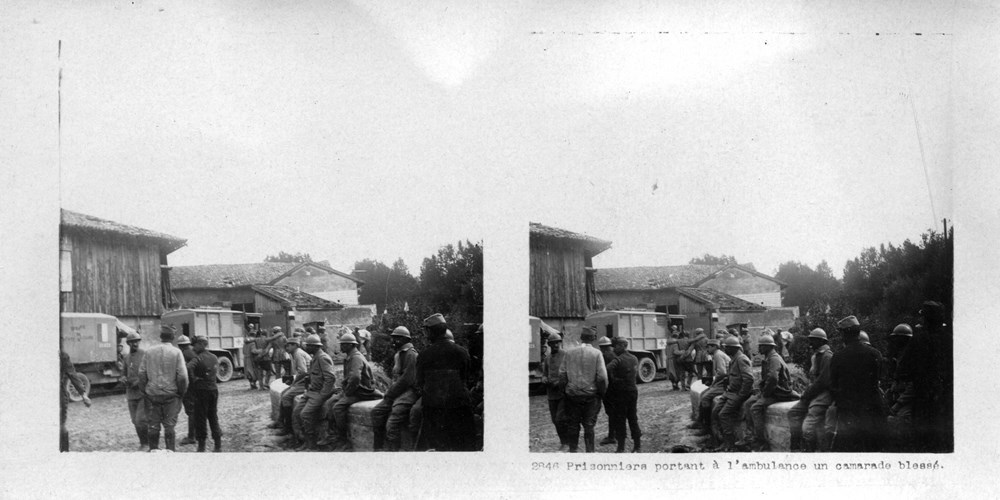 "Prisonniers portant à l'ambulance un camarade blessé" - Prisoners carrying a wounded comrade to the ambulance