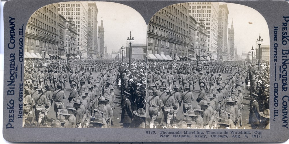 Image Id: 3048 Contributor: The Jordan/Ference Collection Theatre: Home Front Subject: Training Location: Chicago, USA Regiment: Unknown Service Arm: Infantry Battle: Unknown Date: 4 August 1917 Combatants: American Publisher: Presko Binocular Co Source: American Directory: PresKo