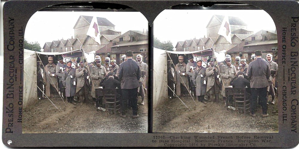 Image Id: 3053 Contributor: The Jordan/Ference Collection Theatre: Western Front Subject: Medical Scenes Location: Unknown Regiment: Unknown Service Arm: Medical Services Battle: Unknown Date: 1916 Combatants: French Publisher: Presko Binocular Co Source: American Directory: PresKo