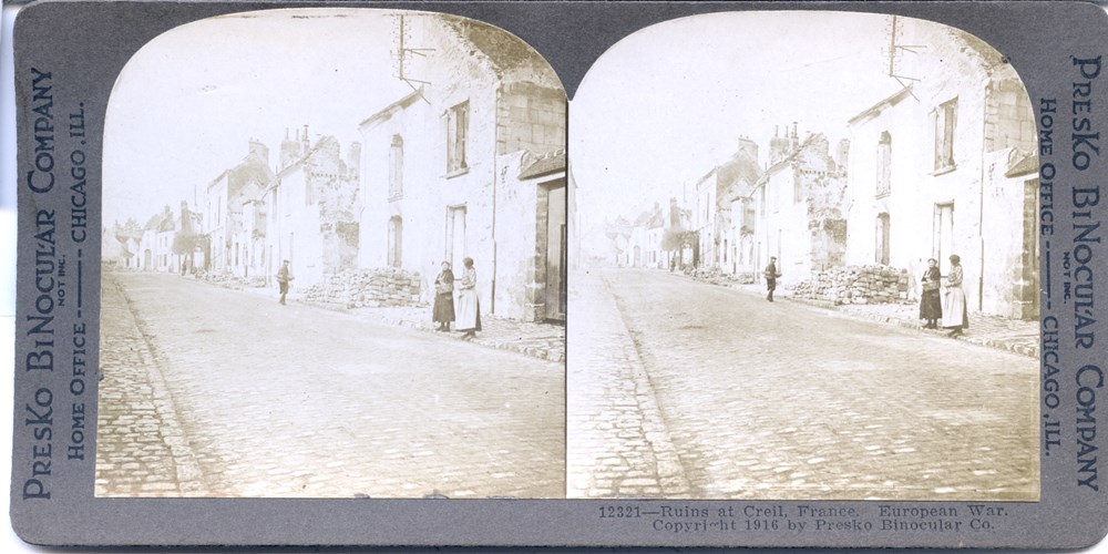 Image Id: 3063 Contributor: The Jordan/Ference Collection Theatre: Western Front Subject: Battle Aftermath Location: Creil, France Regiment: Unknown Service Arm: Unknown Battle: Unknown Date: 1916 Combatants: Unknown Publisher: Presko Binocular Co Source: American Directory: PresKo