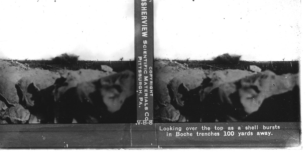 Looking over the top as a shell bursts in Boche trenches 100 yards away