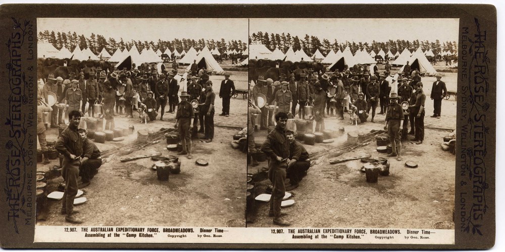 x-ref https://core.ac.uk/display/323035325 and. https://repository.erc.monash.edu/items/show/25683#?c=0&m=0&s=0&cv=0&xywh=0%2C-175%2C3569%2C2299Image Id: 3188 Contributor: The Jordan/Ference Collection Theatre: Home Front Subject: Training Location: Broadmeadows Camp, Victoria, Australia Regiment: AIF Service Arm: Anciliary Services Battle: Unknown Date: Unknown Combatants: Australian Publisher: Rose Stereograph Co Source: Australian Directory: Rose