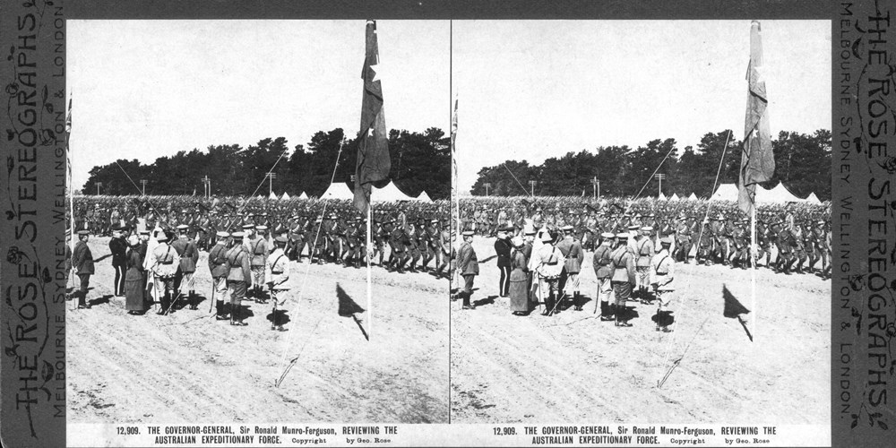 Image Id: 3190 Contributor: The Jordan/Ference Collection Theatre: Home Front Subject: Parades Location: Broadmeadows Camp, Victoria, Australia Regiment: AIF Service Arm: Infantry Battle: Unknown Date: Unknown Combatants: Australian Publisher: Rose Stereograph Co Source: Australian Directory: Rose