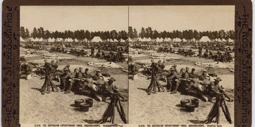 Image Id: 3191 Contributor: The Jordan/Ference Collection Theatre: Home Front Subject: Training Location: Broadmeadows Camp, Victoria, Australia Regiment: AIF Service Arm: Infantry Battle: Unknown Date: Unknown Combatants: Australian Publisher: Rose Stereograph Co Source: Australian Directory: Rose