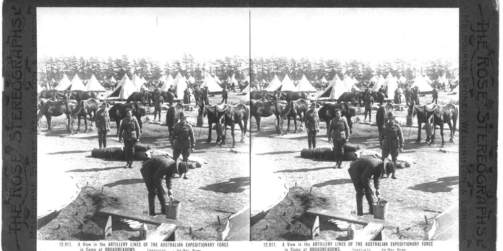 x-ref https://collections.museumsvictoria.com.au/items/1249931 and. https://prov.vic.gov.au/explore-collection/provenance-journal/provenance-2016-17/world-war-i-home-frontImage Id: 3192 Contributor: The Jordan/Ference Collection Theatre: Home Front Subject: Parades Location: Broadmeadows Camp, Victoria, Australia Regiment: AIF Service Arm: Infantry Battle: Unknown Date: Unknown Combatants: Australian Publisher: Rose Stereograph Co Source: Australian Directory: Rose