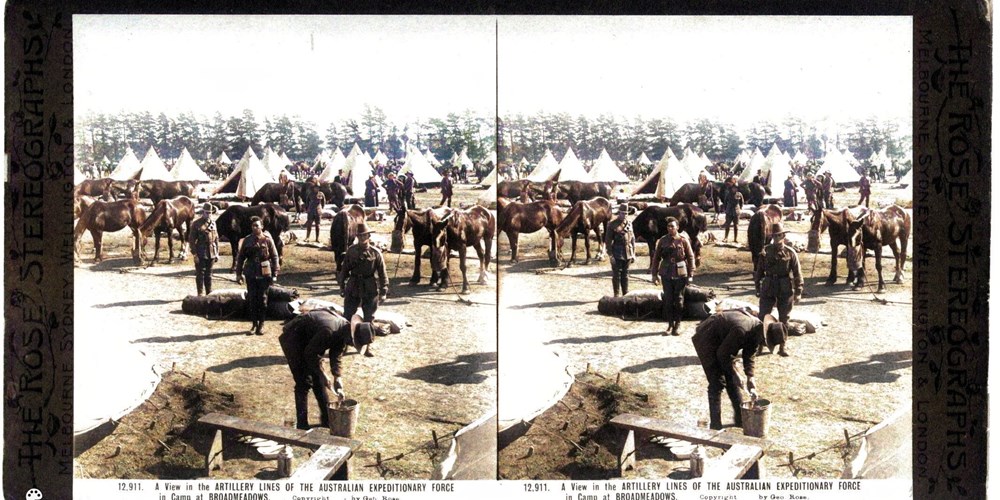 x-ref https://collections.museumsvictoria.com.au/items/1249931 and. https://prov.vic.gov.au/explore-collection/provenance-journal/provenance-2016-17/world-war-i-home-frontImage Id: 3192 Contributor: The Jordan/Ference Collection Theatre: Home Front Subject: Parades Location: Broadmeadows Camp, Victoria, Australia Regiment: AIF Service Arm: Infantry Battle: Unknown Date: Unknown Combatants: Australian Publisher: Rose Stereograph Co Source: Australian Directory: Rose