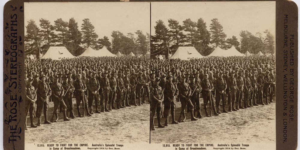 x-ref. https://repository.erc.monash.edu/items/show/25701#?c=0&m=0&s=0&cv=0&xywh=0%2C-55%2C3569%2C2059 and https://www.awm.gov.au/collection/F00164 and https://repository.erc.monash.edu/items/browse?advanced%5B0%5D%5Belement_id%5D=145&advanced%5B0%5D%5BImage Id: 3196 Contributor: The Jordan/Ference Collection Theatre: Home Front Subject: Parades Location: Broadmeadows Camp, Victoria, Australia Regiment: AIF Service Arm: Infantry Battle: Unknown Date: Unknown Combatants: Australian Publisher: Rose Stereograph Co Source: Australian Directory: Rose