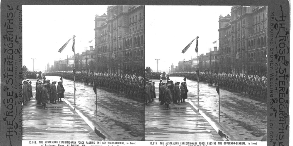 Image Id: 3199 Contributor: The Jordan/Ference Collection Theatre: Home Front Subject: Parades Location: Parliament House, Melbourne, Victoria Regiment: AIF Service Arm: Infantry Battle: Unknown Date: Unknown Combatants: Australian Publisher: Rose Stereograph Co Source: Australian Directory: Rose