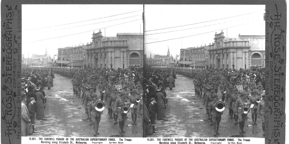Image Id: 3201 Contributor: The Jordan/Ference Collection Theatre: Home Front Subject: Parades Location: Elizabeth St, Melbourne, Victoria, Australia Regiment: AIF Service Arm: Infantry Battle: Unknown Date: Unknown Combatants: Australian Publisher: Rose Stereograph Co Source: Australian Directory: Rose