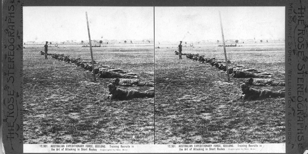 Image Id: 3211 Contributor: The Jordan/Ference Collection Theatre: Home Front Subject: Training Location: Geelong, Victoria, Australia Regiment: AIF Service Arm: Infantry Battle: Unknown Date: Unknown Combatants: Australian Publisher: Rose Stereograph Co Source: Australian Directory: Rose