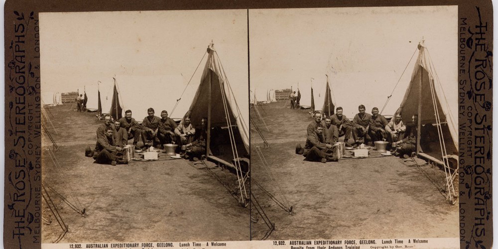 Image Id: 3212 Contributor: The Jordan/Ference Collection Theatre: Home Front Subject: Training Location: Geelong, Victoria, Australia Regiment: AIF Service Arm: Infantry Battle: Unknown Date: Unknown Combatants: Australian Publisher: Rose Stereograph Co Source: Australian Directory: Rose