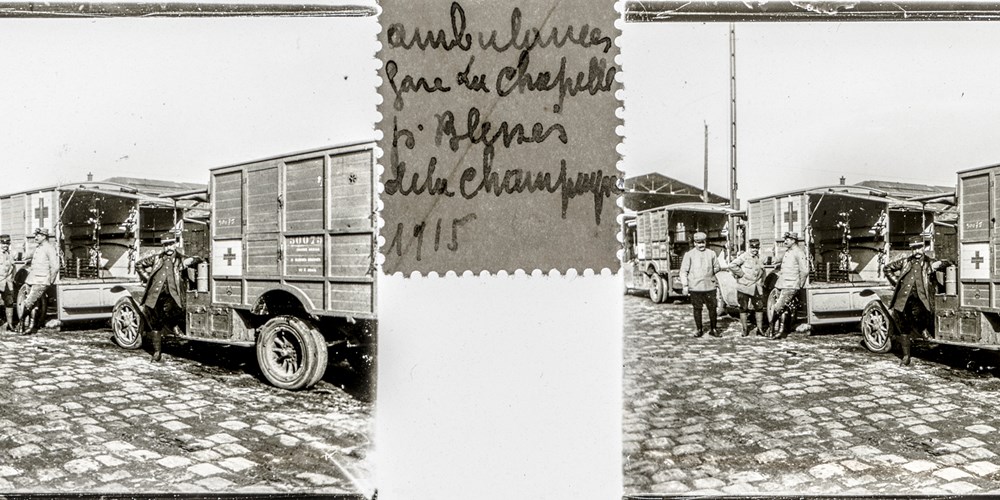 Image Id: 3214 Contributor: The Jordan/Ference Collection Theatre: Western Front Subject: Behind the Lines Location: La Chapelle d'Armentières near Lille, France Regiment: Unknown Service Arm: Medical Services Battle: Unknown Date: 1915 Combatants: French Publisher: Amateur Stereographers (Collections) Source: French Directory: Ambulance-Convoys-1915-1916