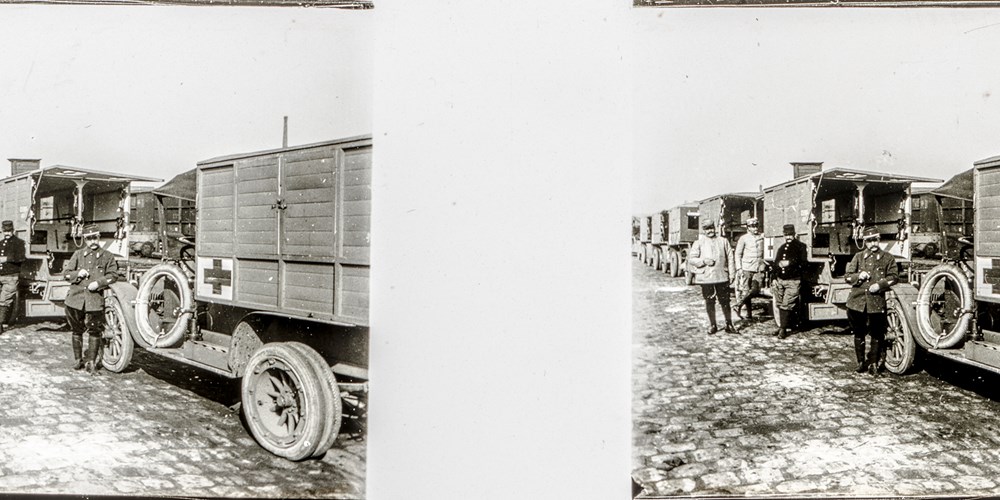 Image Id: 3216 Contributor: The Jordan/Ference Collection Theatre: Western Front Subject: Behind the Lines Location: La Chapelle d'Armentières near Lille, France Regiment: Unknown Service Arm: Medical Services Battle: Unknown Date: 1915 Combatants: French Publisher: Amateur Stereographers (Collections) Source: French Directory: Ambulance-Convoys-1915-1916