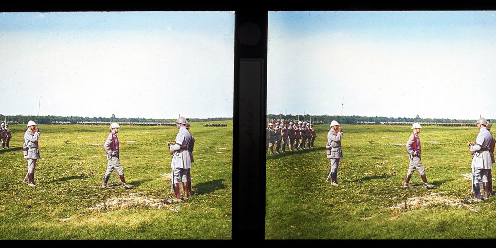 Image Id: 3495 Contributor: The Jordan/Ference Collection Theatre: Western Front Subject: Parades Location: Unknown Regiment: Unknown Service Arm: Unknown Battle: Unknown Date: Unknown Combatants: French Publisher: Amateur Stereographers (Collections) Source: French Directory: OfficersAndBalloons