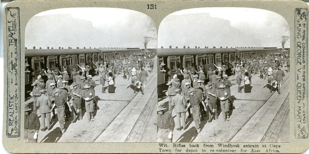 Wit. Rifles back from Windhoek entrain at Cape Town for depot to re-volunteer for East Africa