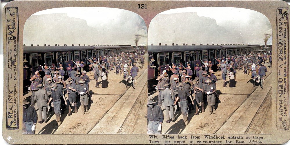 Wit. Rifles back from Windhoek entrain at Cape Town for depot to re-volunteer for East Africa