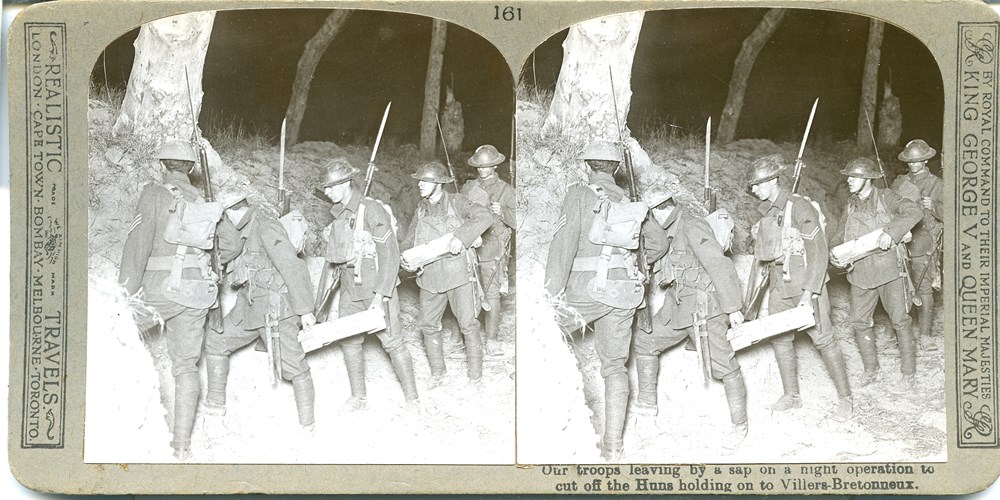 Our troops leaving by a sap on a night operation to cut off the Huns holding on to Villers-Bretonneux