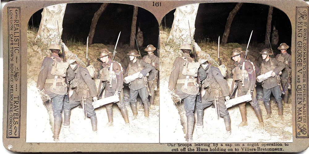 Our troops leaving by a sap on a night operation to cut off the Huns holding on to Villers-Bretonneux