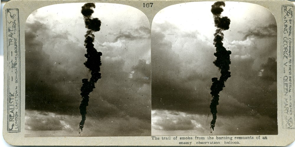 The trail of smoke from the burning remnants of an enemy observation balloon