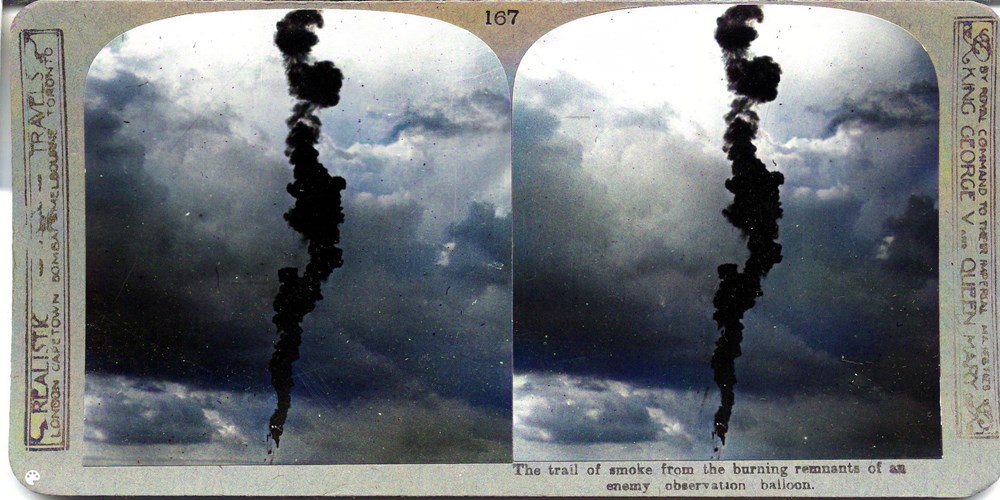 The trail of smoke from the burning remnants of an enemy observation balloon