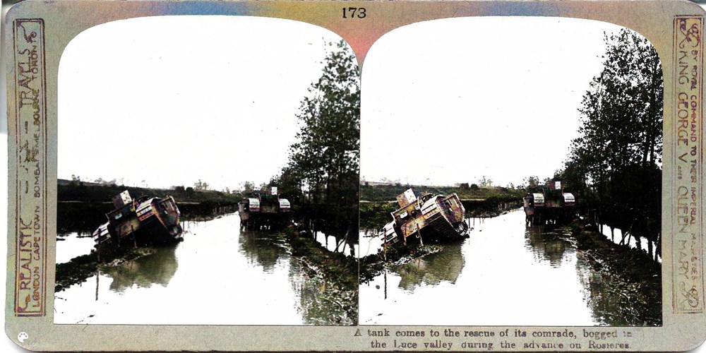 A tank comes to the rescue of its comrade, bogged in the Luce valley during the advance on Rosieres