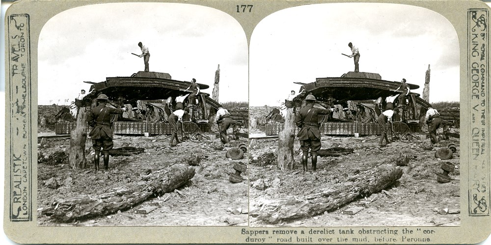 Image Id: 428 Contributor: The Jordan/Ference Collection Theatre: Western Front Subject: Battle Aftermath Location: Peronne, France Regiment: Unknown Service Arm: Tanks/Armoured Cars Battle: Unknown Date: Unknown Combatants: British Publisher: Realistic Travels Source: British Directory: Set of 600 101-200