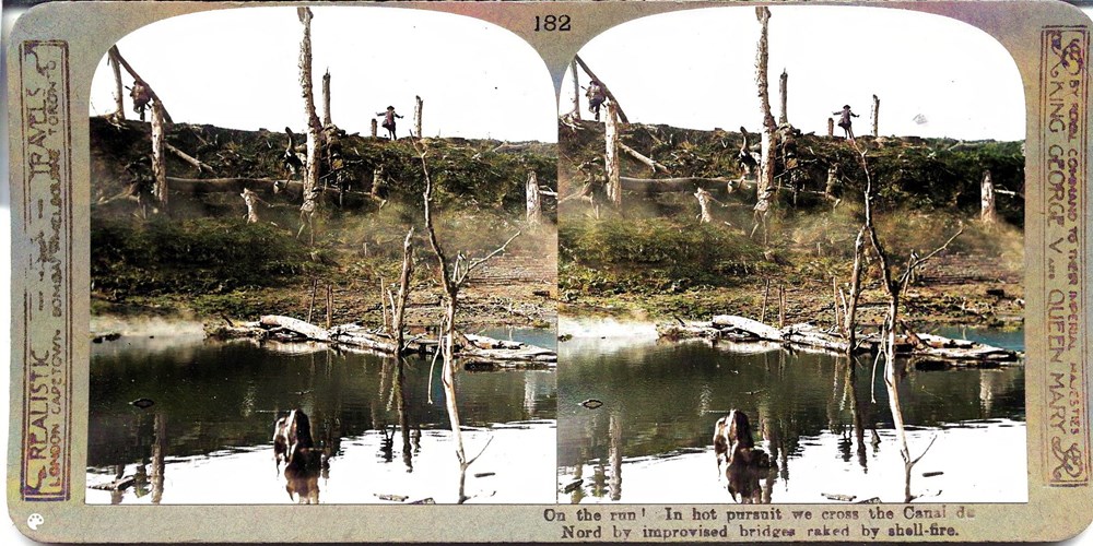 On the run! In hot pursuit we cross the Canal du Nord by improvised bridges raked by shell-fire