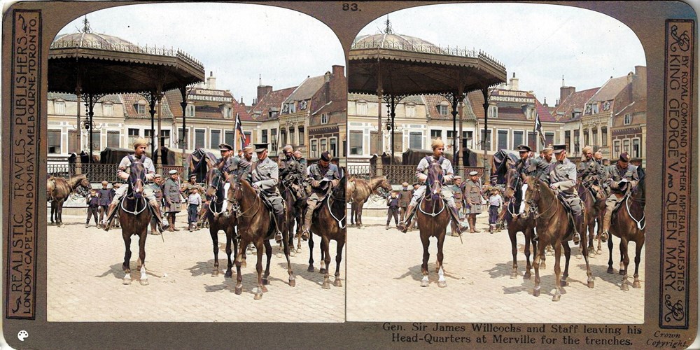 Gen. Sir James Willcocks and Staff leaving his Head-Quarters at Merville for the trenches.