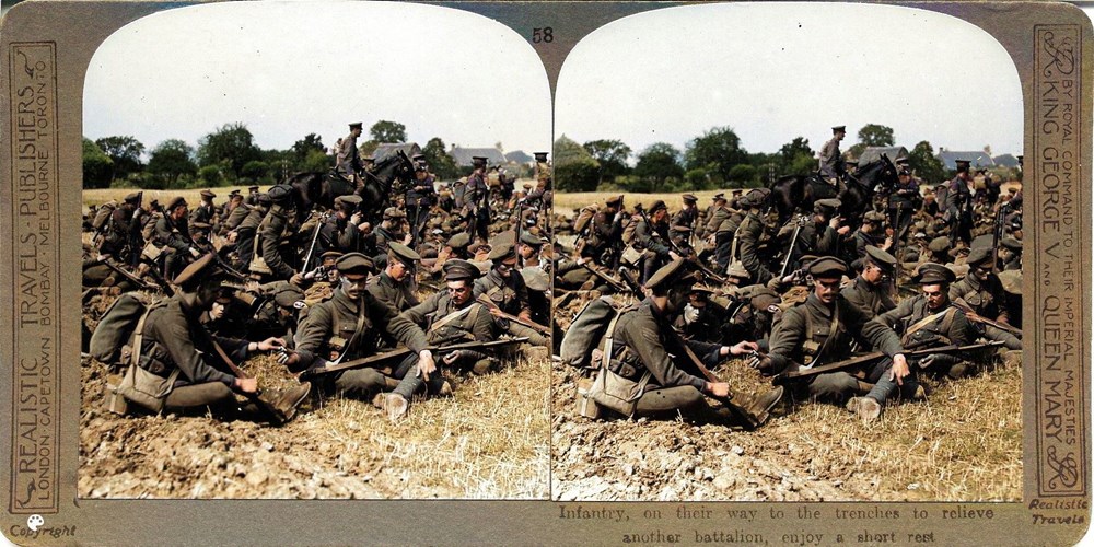 Infantry, on their way to the trenches to relieve another battalion enjoy a short rest.